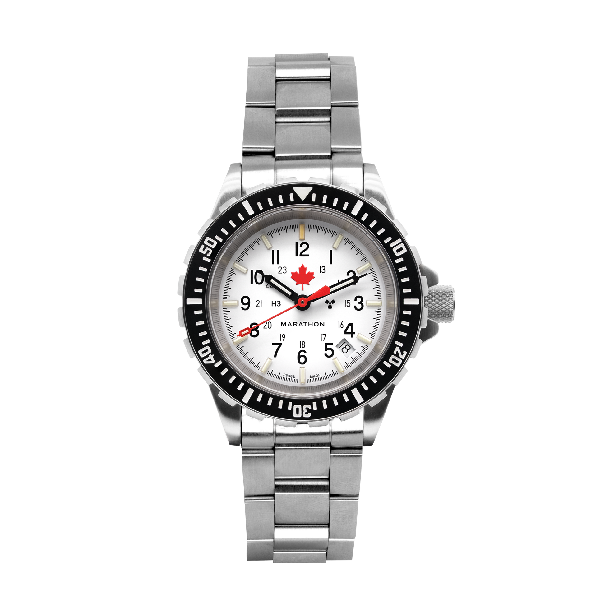 Marathon's 41mm Arctic Red Maple Edition Large Diver's Automatic is a renowned Government Search and Rescue (GSAR) timepiece. This model features a stark white dial specially chosen to reduce glare in bright environments and is adorned with a Red Maple Leaf dial appliqué, paying homage to Canada's rich military heritage.