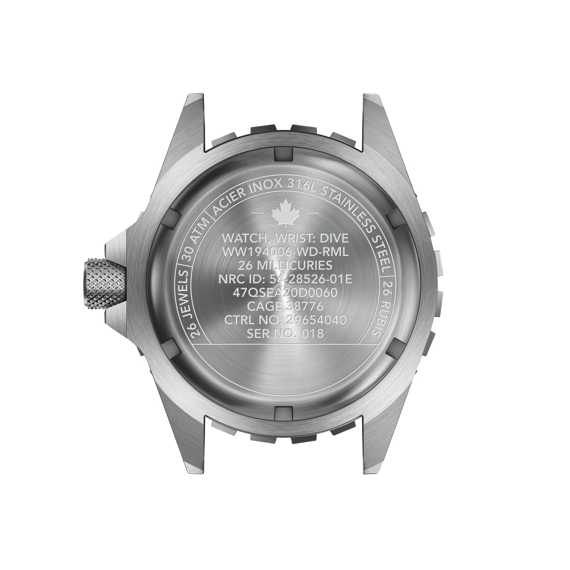 Designed in Canada, this watch is Swiss-made and features a 26 Jewel Sellita SW200-1 movement with Incabloc shock absorber providing premium precision. The outer shell of the Arctic Red Maple GSAR consists of a 316L stainless steel case with a brushed finish (measuring 41mm in diameter and 14mm thick), a screw-in crown, and a sapphire crystal. The unidirectional bezel with 60-minute scale and two dial scales (1-12 and 13-24) ensures precise timing for professional or recreational diving. The Arctic Red Maple GSAR also features tritium gas tubes on all hour markers and the full hand set for constant illumination in low light conditions, with an orange tritium marker at the 12 o'clock position and a MaraGlo bezel pip for easy orientation. The watch is rated 30ATM, allowing it to function at depths of up to 300M (1000FT) underwater.