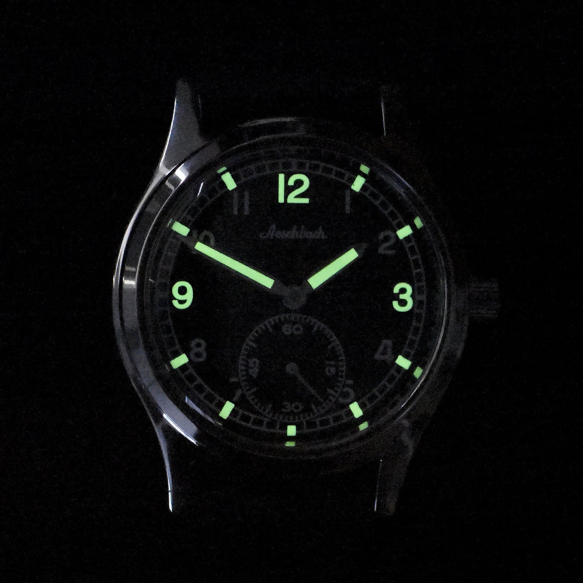 This automatic self-winding classic WW2 pattern Aeschbach* military watch with a small subsidiary dial second hand is based on the typical designs used by the German Wehrmacht and the Luftwaffe during World War II. This watch is closely based on one of Aeschbach's WW2 designs, although the original watches are now quite rare and tend to fetch high prices this watch is outwardly almost indistinguishable from the factories WW2 models and retains the acrylic crystal used on the original watches, also the original 15 Jewel hand-winding mechanical movement is upgraded to a 21 Jewel self-winding automatic which can also be manually wound if required. The watch offers the benefit of retaining the original outward appearance whilst having the advantage of a few discreet updates to improve its suitability for use on a day-to-day basis.