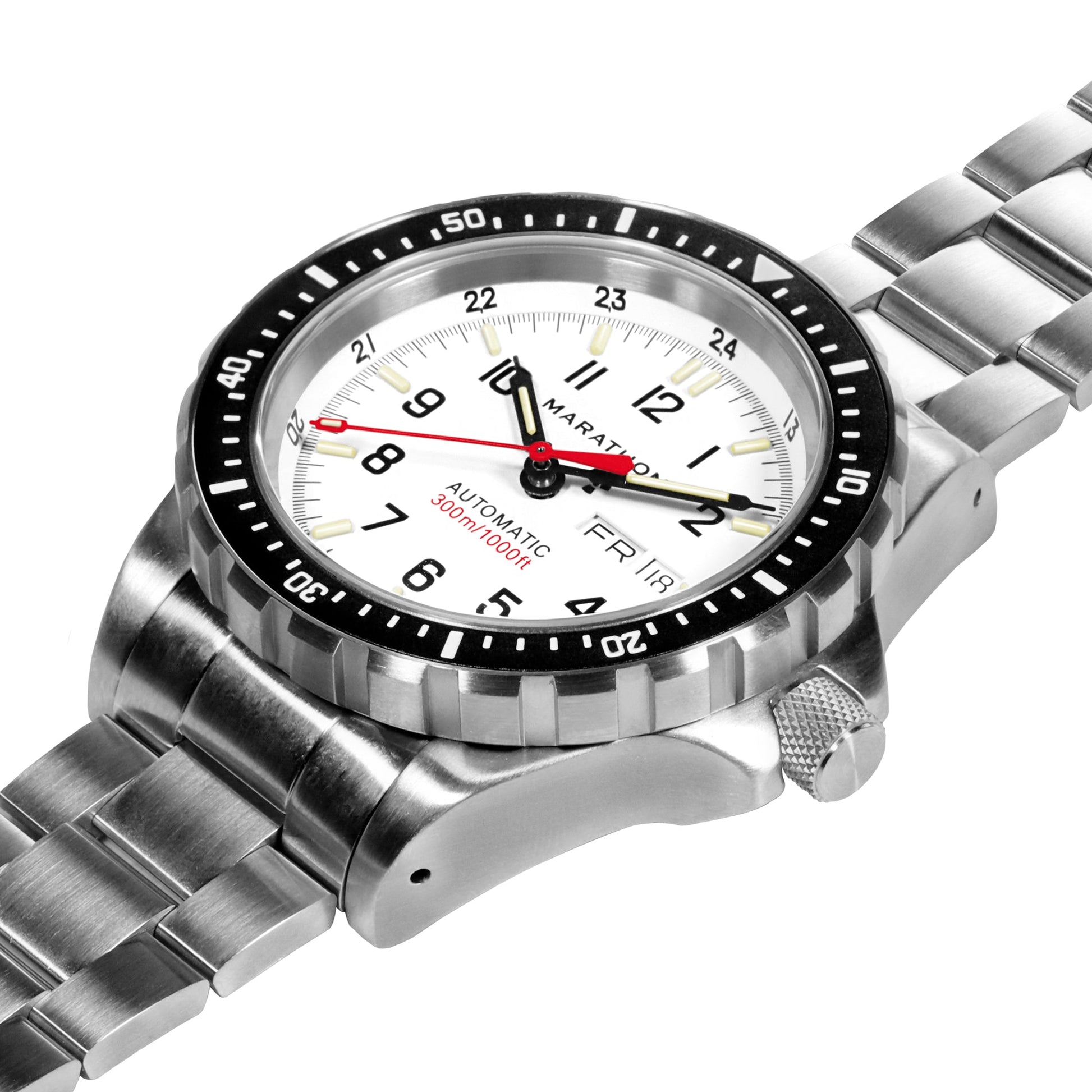 The Marathon 46mm Arctic JDD is a rugged and reliable dive watch engineered for use in the most extreme conditions. This model features a stark white dial specially chosen to reduce glare in bright environments. Designed in Canada, this watch is Swiss-made and features a 26 Jewel Sellita SW220 movement with Incabloc™ shock absorber providing premium precision. The watch also includes a day/date calendar, equipped with Rapid Day Date Correction which allows for easy adjustment of the day and date.