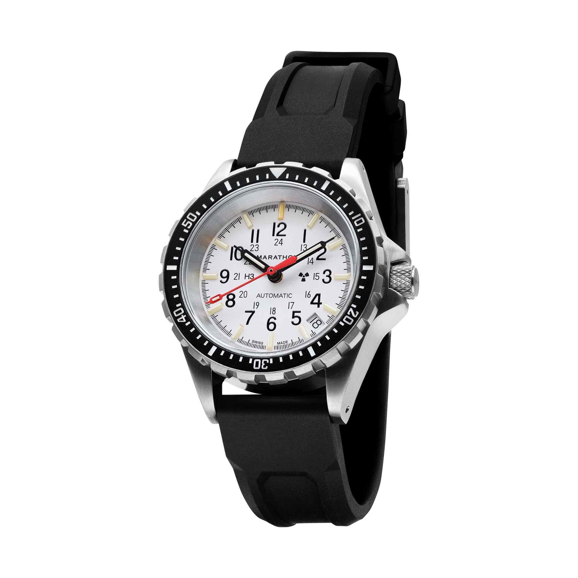 Marathon Search and Rescue (SAR) watches were developed to Canadian Government requirements for use in SAR operations. Built to withstand extreme conditions and match the capabilities of the user. First introduced in the early 1990s, they are still in active use today. Overbuilt bezels for manipulation with gloved hands; low-light illumination for use in night missions; screw-in crown and O-ring system for 30ATM water-resistance; high-torque pinions connecting movement to hands; Incabloc™ shock absorbers on all automatic movements. Powered by Swiss-made automatic or quartz movements, the SAR diver’s watches are available in 36mm, 41mm, and 46mm case sizes.