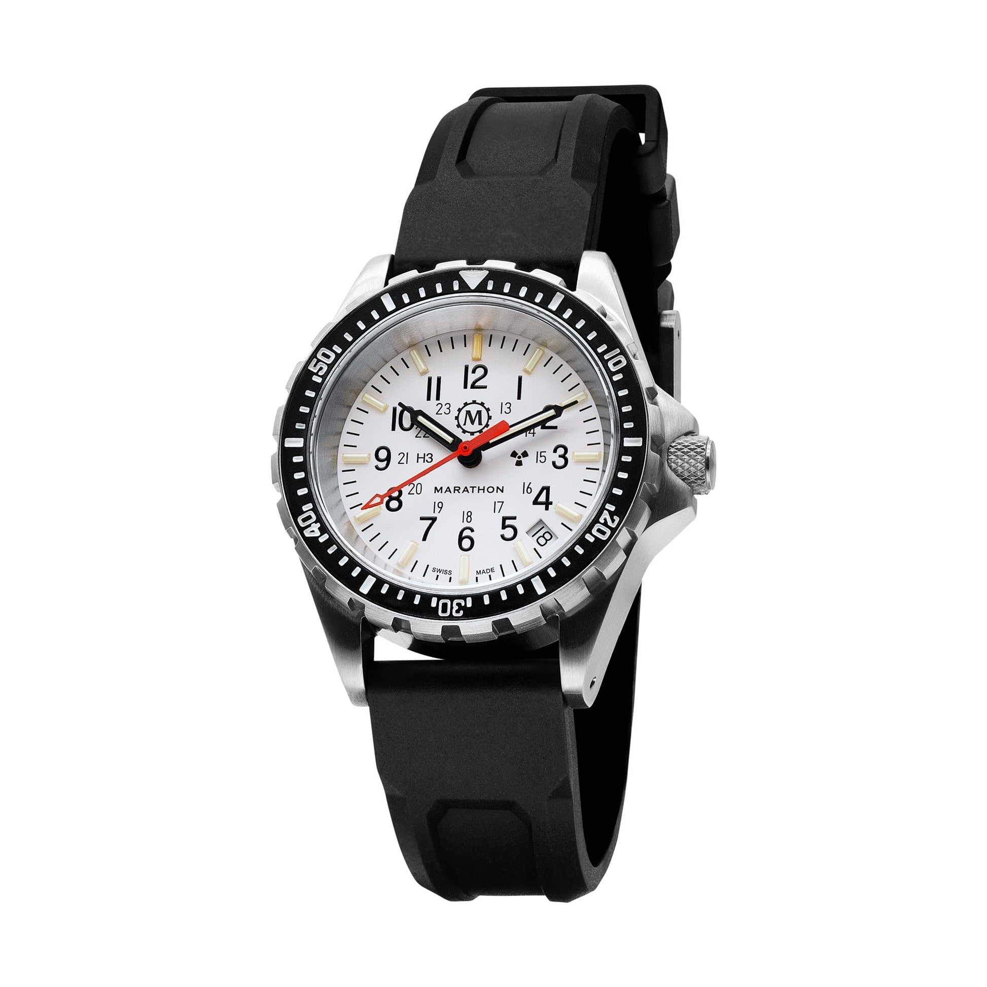 Marathon Search and Rescue (SAR) watches were developed to Canadian Government requirements for use in SAR operations. Built to withstand extreme conditions and match the capabilities of the user. First introduced in the early 1990s, they are still in active use today. Overbuilt bezels for manipulation with gloved hands; low-light illumination for use in night missions; screw-in crown and O-ring system for 30ATM water-resistance; high-torque pinions connecting movement to hands; Incabloc™ shock absorbers on all automatic movements. Powered by Swiss-made automatic or quartz movements, the SAR diver’s watches are available in 36mm, 41mm, and 46mm case sizes.