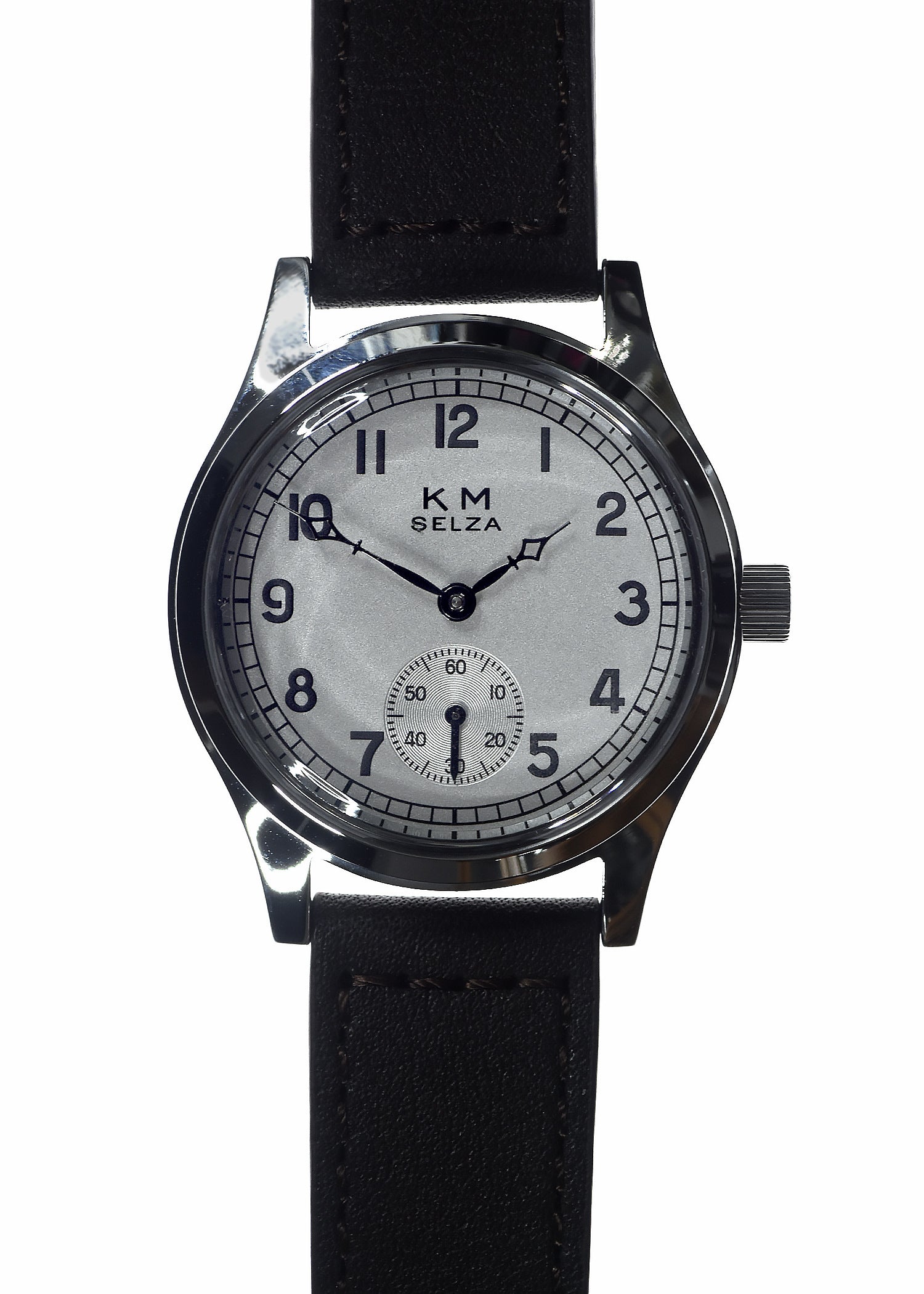 This automatic self-winding classic WW2 pattern Selza* military watch with a small subsidiary dial second hand is based on the typical designs used by the German Kriegsmarine (German Navy) during World War II, one feature which was common to all of the watches made for this branch of the German forces is that they tended to have the initials K.M on the dial which is short for Kriegsmarine and also had light colored dials in either cream or white as opposed to black which was used for other versions of the German forces. This watch is closely based on one of Selza's WW2 designs, although the original watches are now quite rare and tend to fetch high prices this watch is outwardly almost indistinguishable from the factories WW2 models and retains the acrylic crystal used on the original watches, also the original 15 Jewel hand-winding mechanical movement is upgraded to a 21 Jewel self-winding automatic which can also be manually wound if required. The watch offers the benefit of retaining the original outward appearance whilst having the advantage of a few discreet updates to improve its suitability for use on a day-to-day basis.