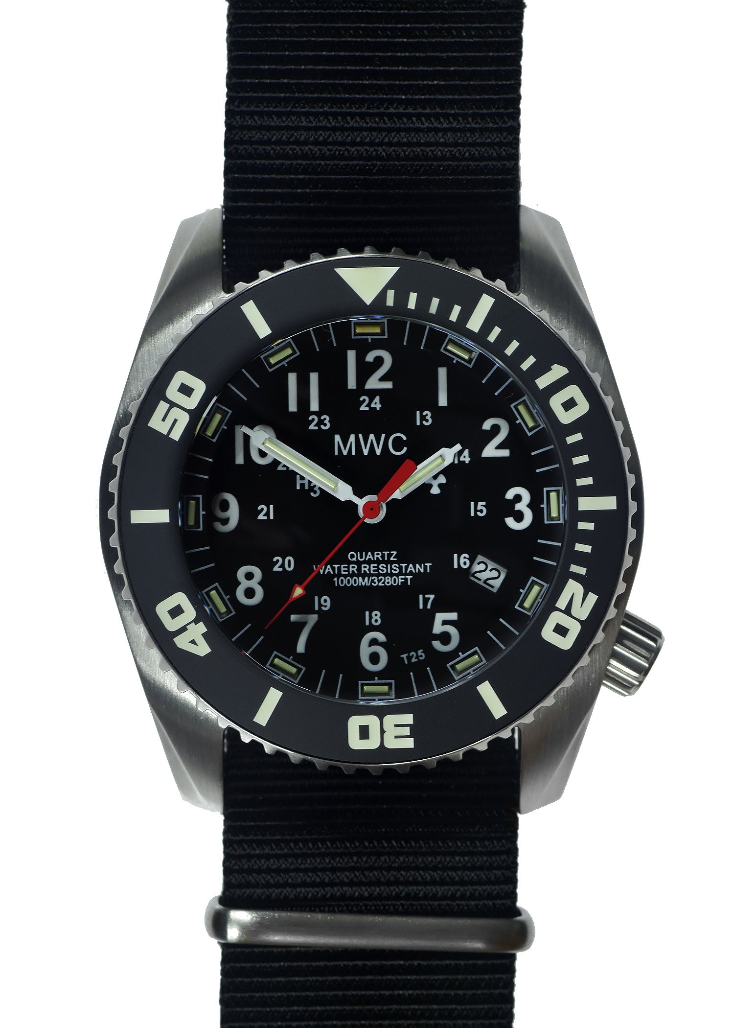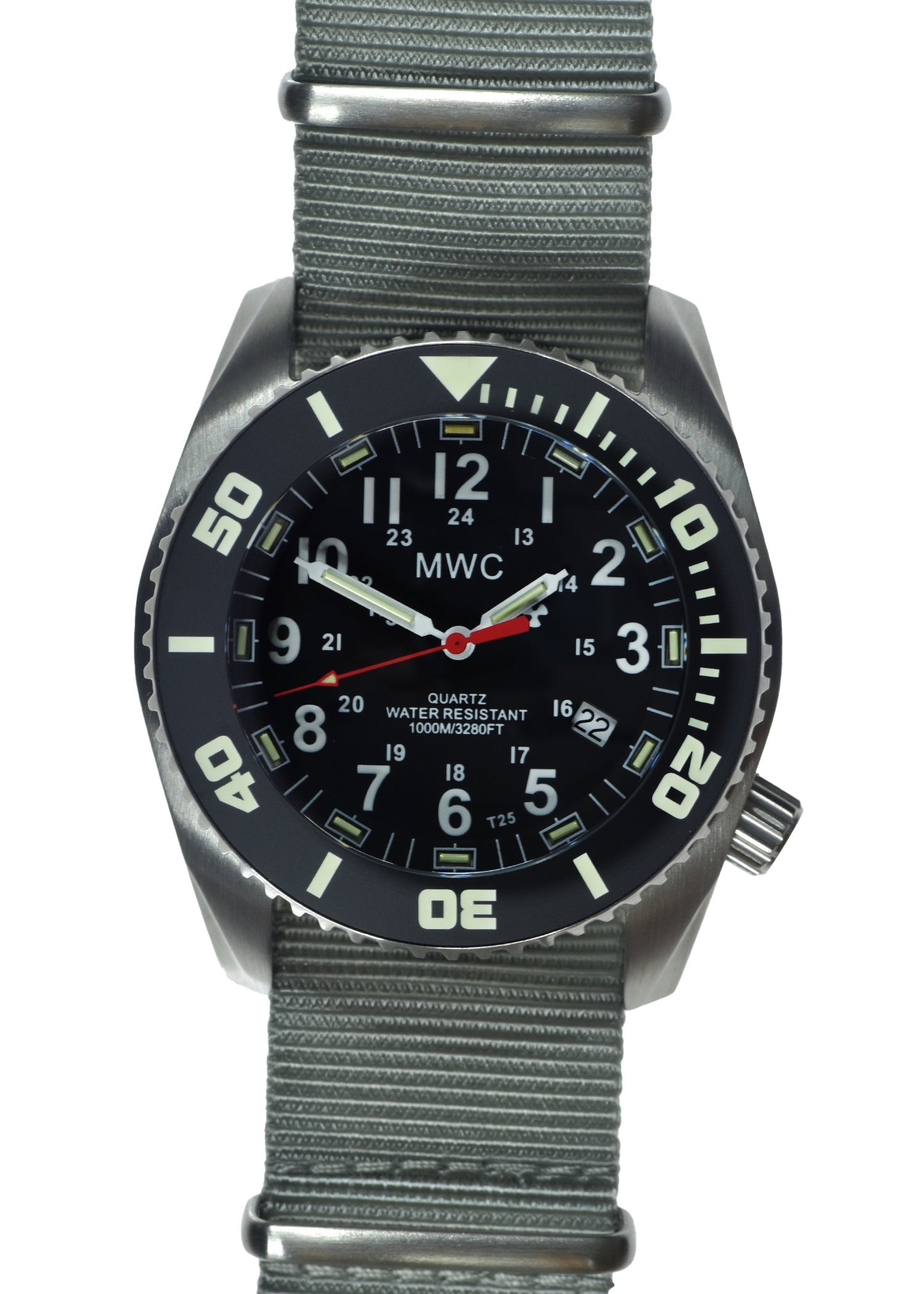The MWC "Depthmaster" range of Military Divers models are MWC's latest heavy-duty range and are both extremely robust with a sapphire crystal and suitable for diving with mixed gases at extreme depths due to the 100atm water resistance rating, they also have a wider strap at 24 mm (most military divers watches use a 20mm strap) and a non-scratch ceramic bezel which is easier to grip in very cold and icy conditions. This model also has tritium GTLS tubes for maximum nighttime and low light performance. The Depthmaster range is specifically designed for use by professional divers under challenging conditions.