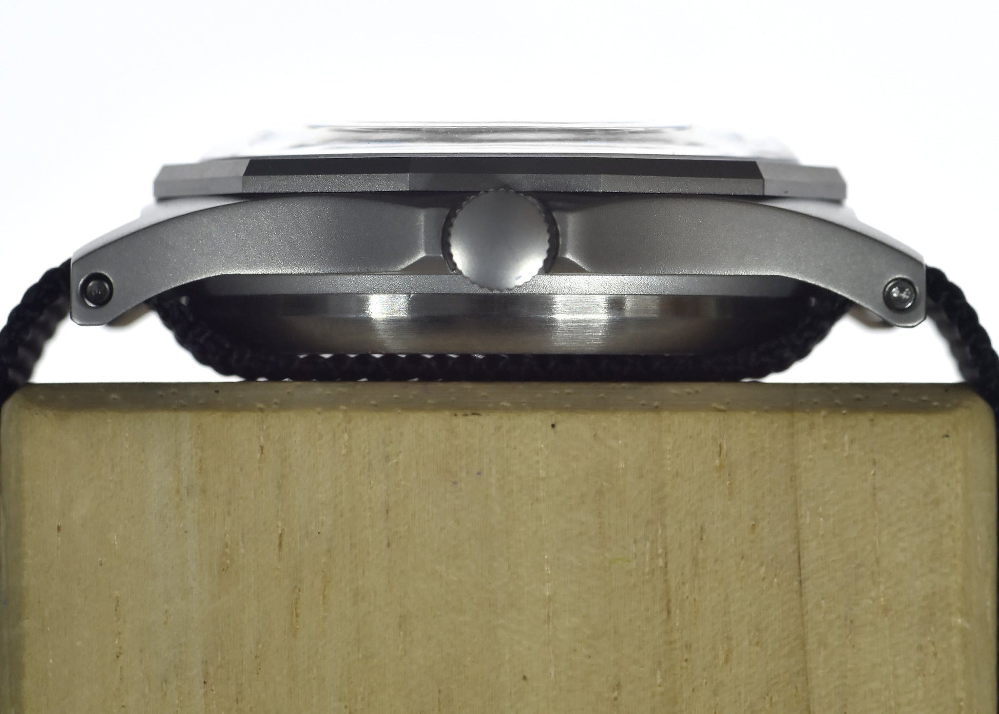 The watch uses Super Luminova for improved nighttime visibility although it retains the encircled T rather than an encircled L for historical reasons. Super Luminova operates like a light battery, after sufficient activation by sunlight or artificial light, the pigment glows in the dark until the luminosity gradually diminishes although larger markings are often visible for the whole night, if needed it's very easy to recharge the luminosity simply by exposing the watch to bright light for a few minutes. This activation and subsequent light emission process can be repeated again and again, and the material does not suffer aging which was an issue with the old radioactive pigments which declined dramatically after around 10 years. The other advantage is that Super Luminova pigments are 100% free of radioactivity, the original watches we made in the 80s used tritium paint hence the encircled T on the dial.