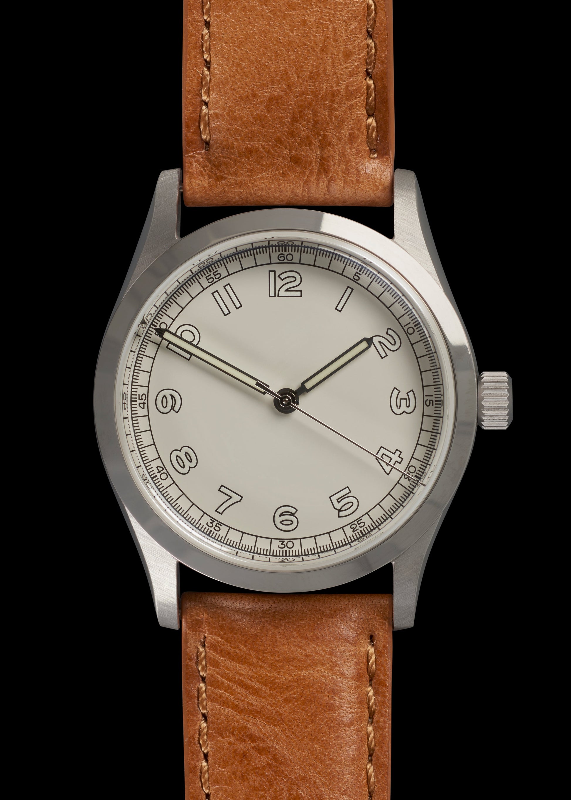 The watch uses Luminova as opposed to the Tritium which was used in the 1960s. The main advantage with Luminova is that unlike Tritium it does not deteriorate with age and is non radioactive. On this particular variant the paint colour mimics the appearance of aged Tritium paint and although the T is encircled, which would indicate tritium, this is done only for historical reasons.