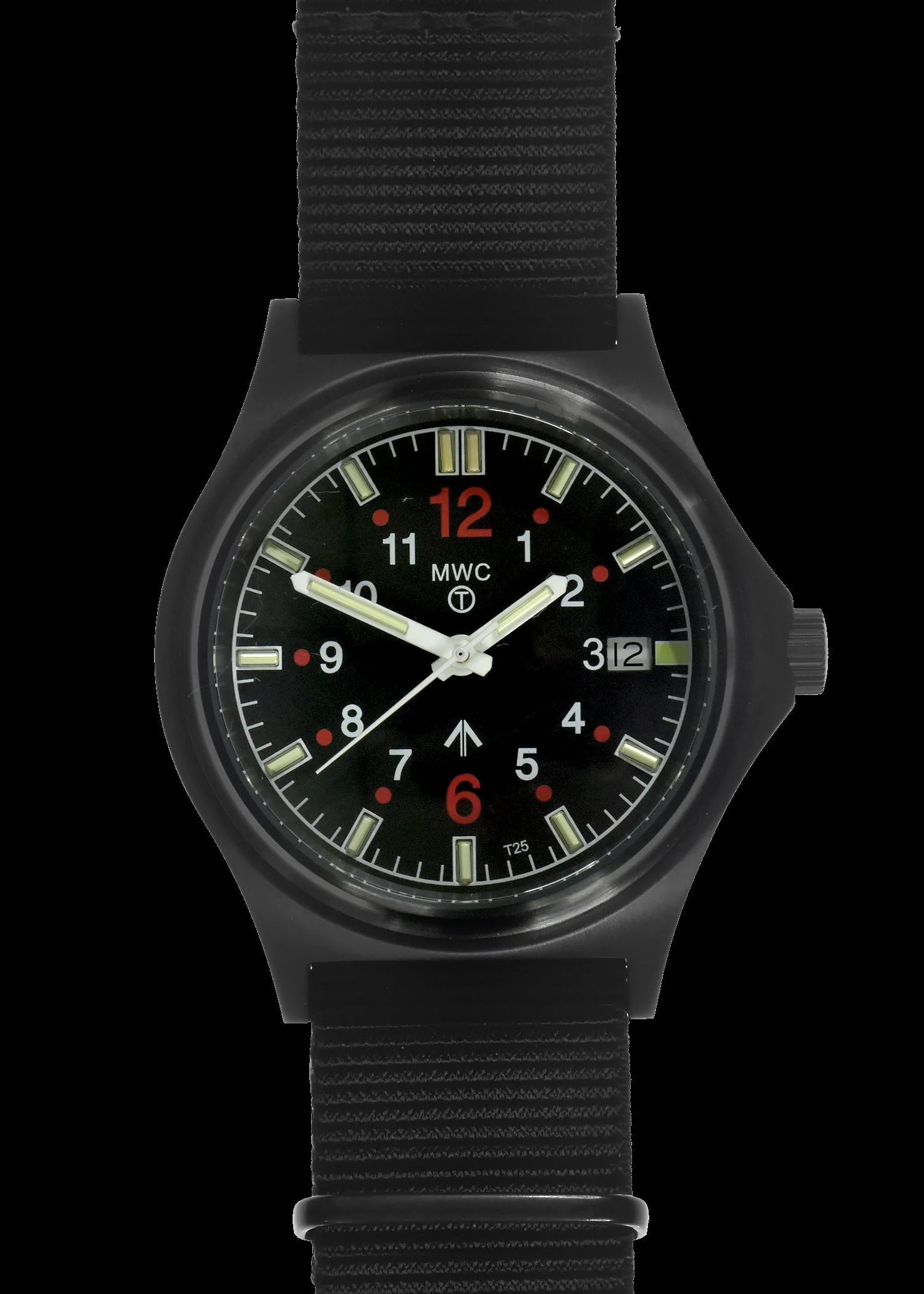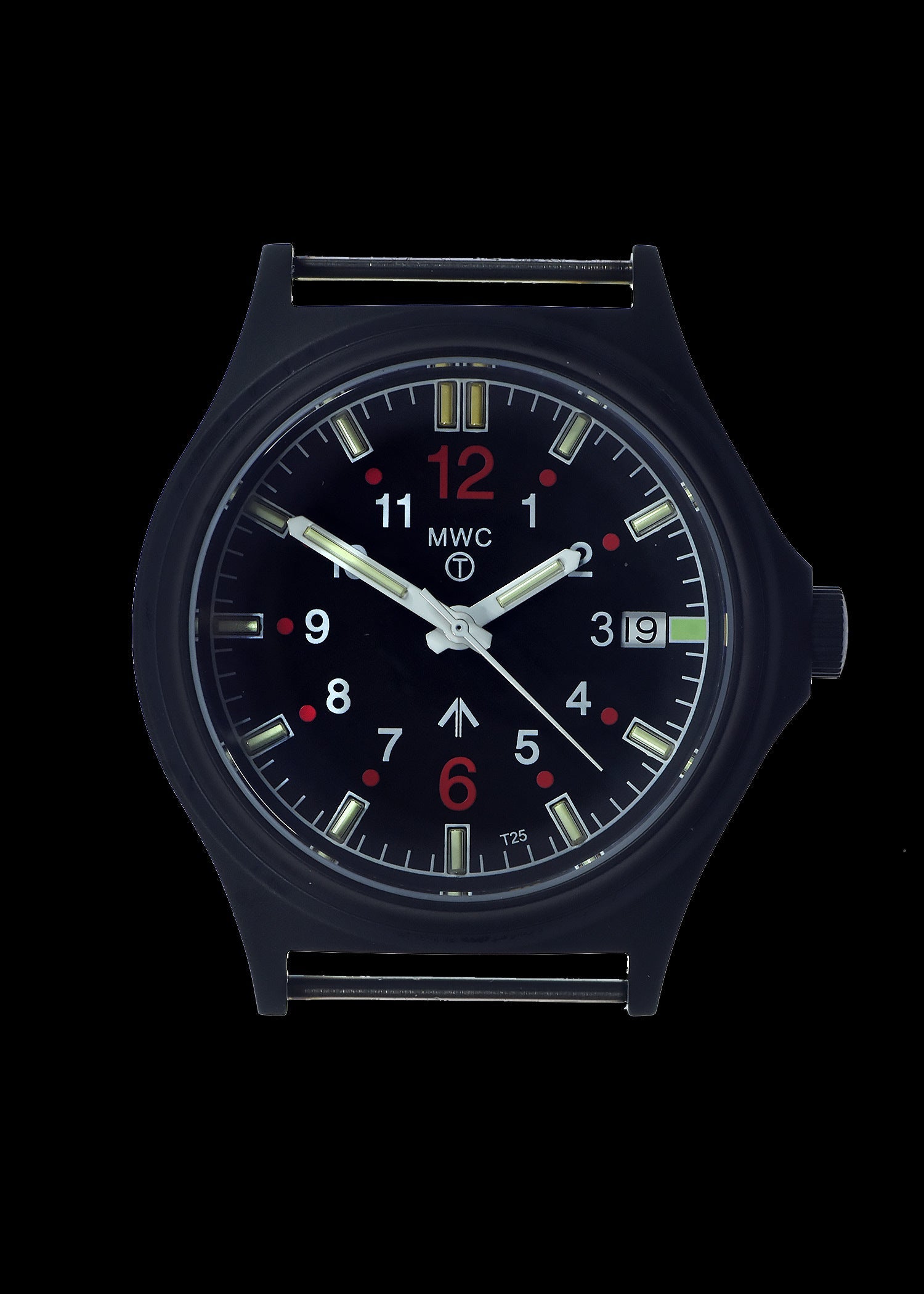 The self-luminous system ensures easy readability at night. The MKV model features a distinctive face layout, with the hour and minute hands each containing a brightly glowing vial of tritium gas. Additionally, it has two lights at the 12 o'clock position, a unique feature to MWC. While the vials contain radioactive gas, their combined amount is well below the personal limit of 25 millicuries, as per U.S. Nuclear Regulatory Commission regulations (10 CFR 30.15).