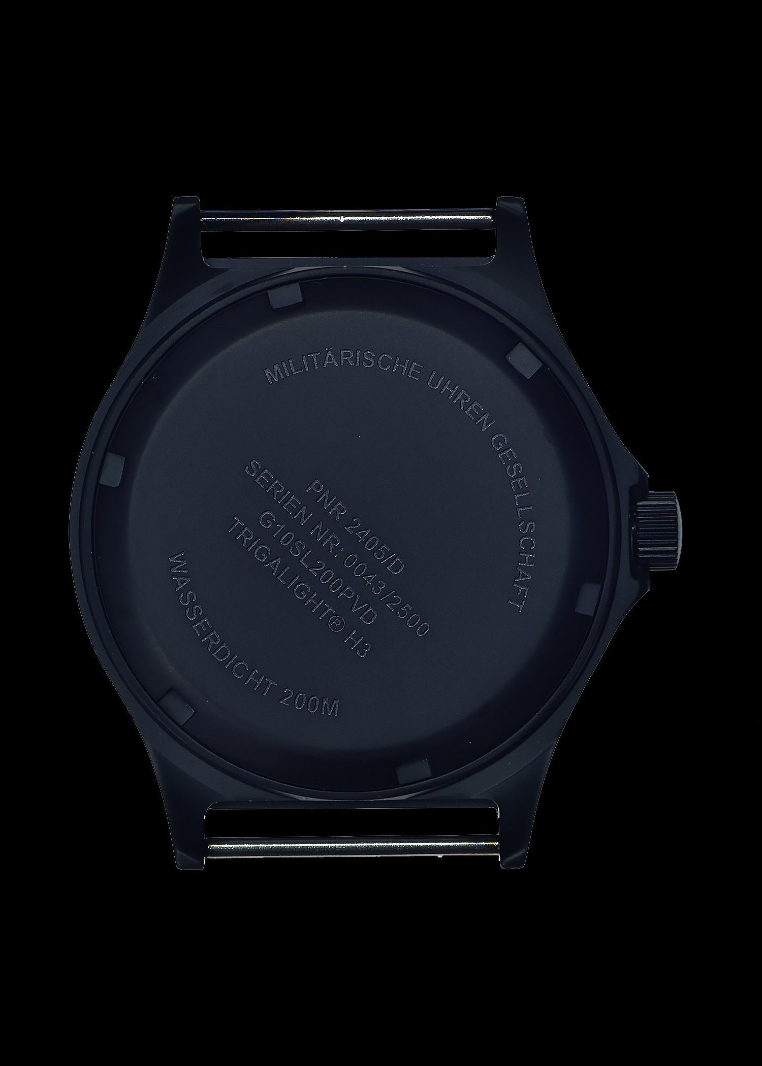 The G10 SL MKV is supplied with a heavyweight NATO webbing strap. The reverse of the case features various contract markings.