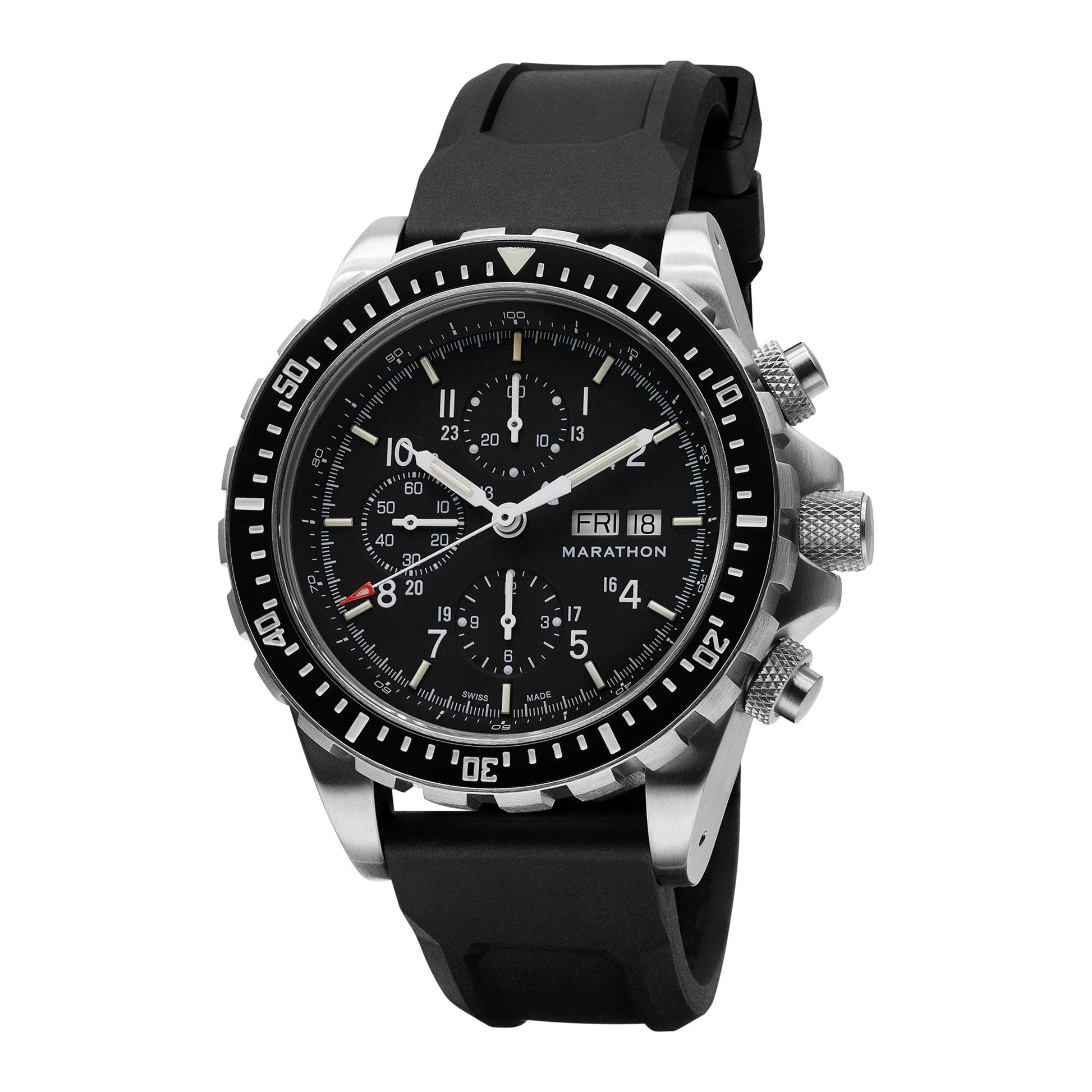 Featuring a 25-jewel automatic chronograph movement with 1/5th of a second accuracy, the stopwatch function uses 1/100 of a minute, decimal timing for use in flight record logbooks and tracking fuel consumption. The watch can track elapsed time up to 12 hours, making it the ideal choice for pilots and divers.