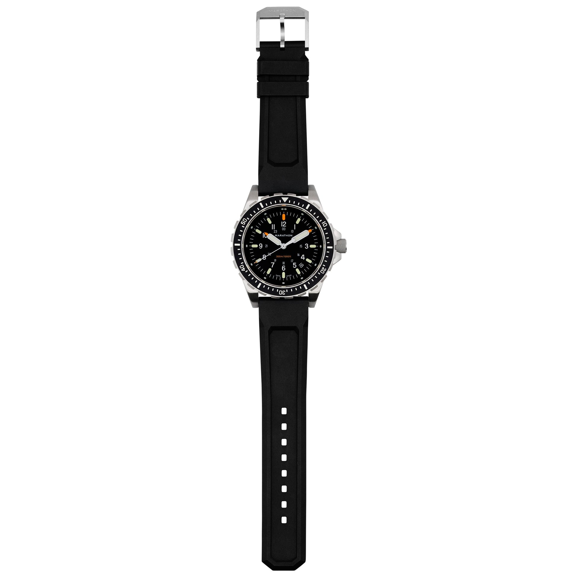Included with the JSAR is our 3-Piece Rubber Strap Kit, also manufactured in La Chaux-de-Fonds, Switzerland, our strap kit is crafted from FKM Rubber to meet the requirements of high-performance military applications. The 3-Piece Kit comes with one (6 o'clock) tail piece with 8 adjustment holes, and two (12 o'clock) buckle pieces of different sizing that allow the wearer to tailor the length to fit their wrist size.