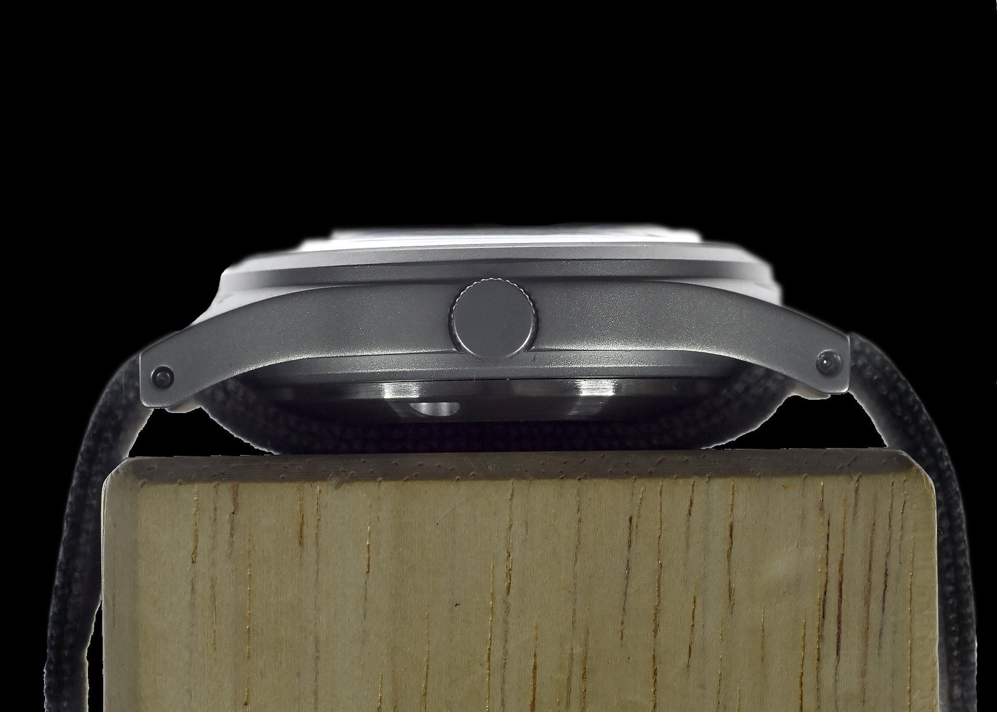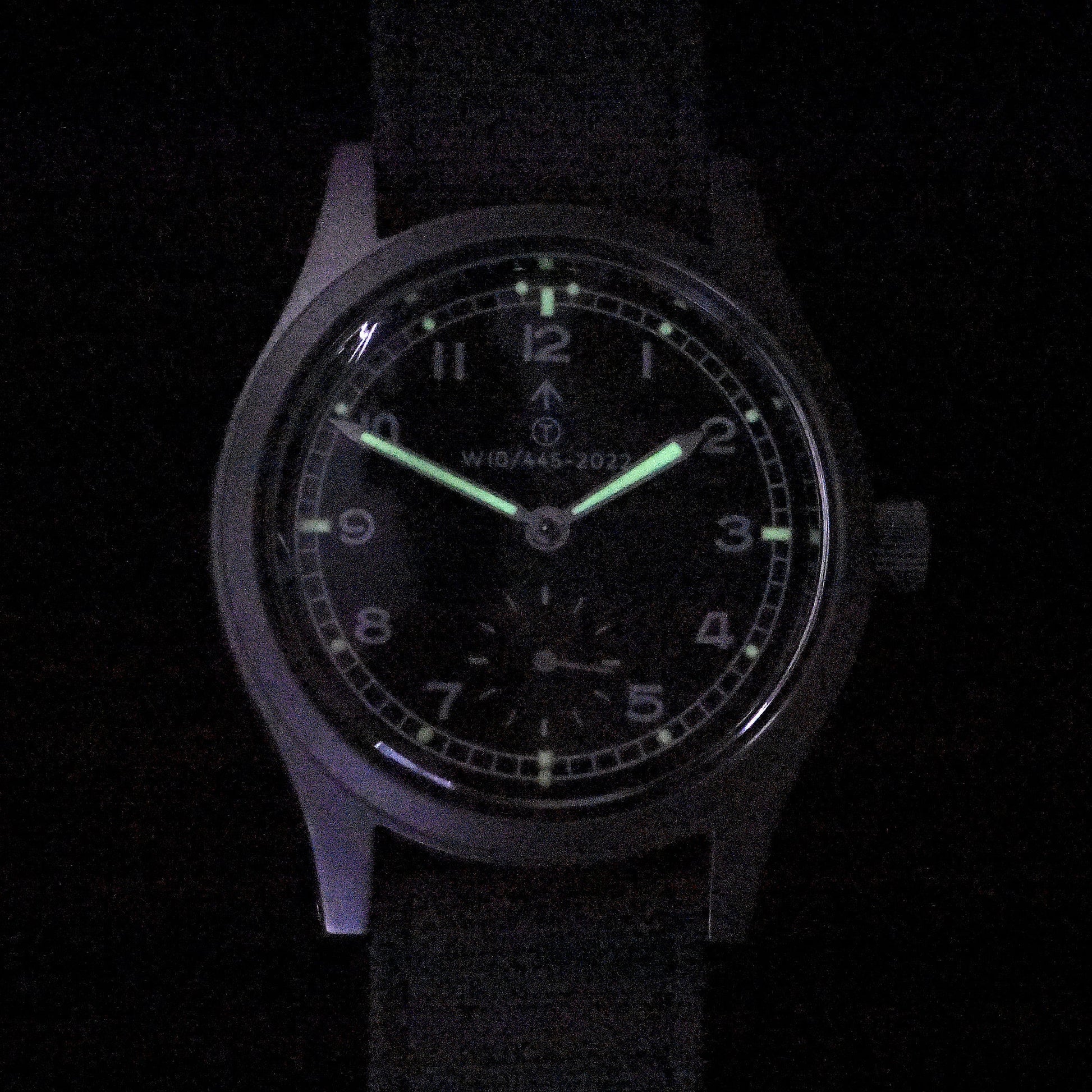 This watch has a heavy stainless steel satin finish case made from Military Grade 316L stainless steel, subsidiary dial second hand, hacking function, black dial and luminous markings. The watch also has a historically accurate canvas strap as used in the 1940s and 50s.