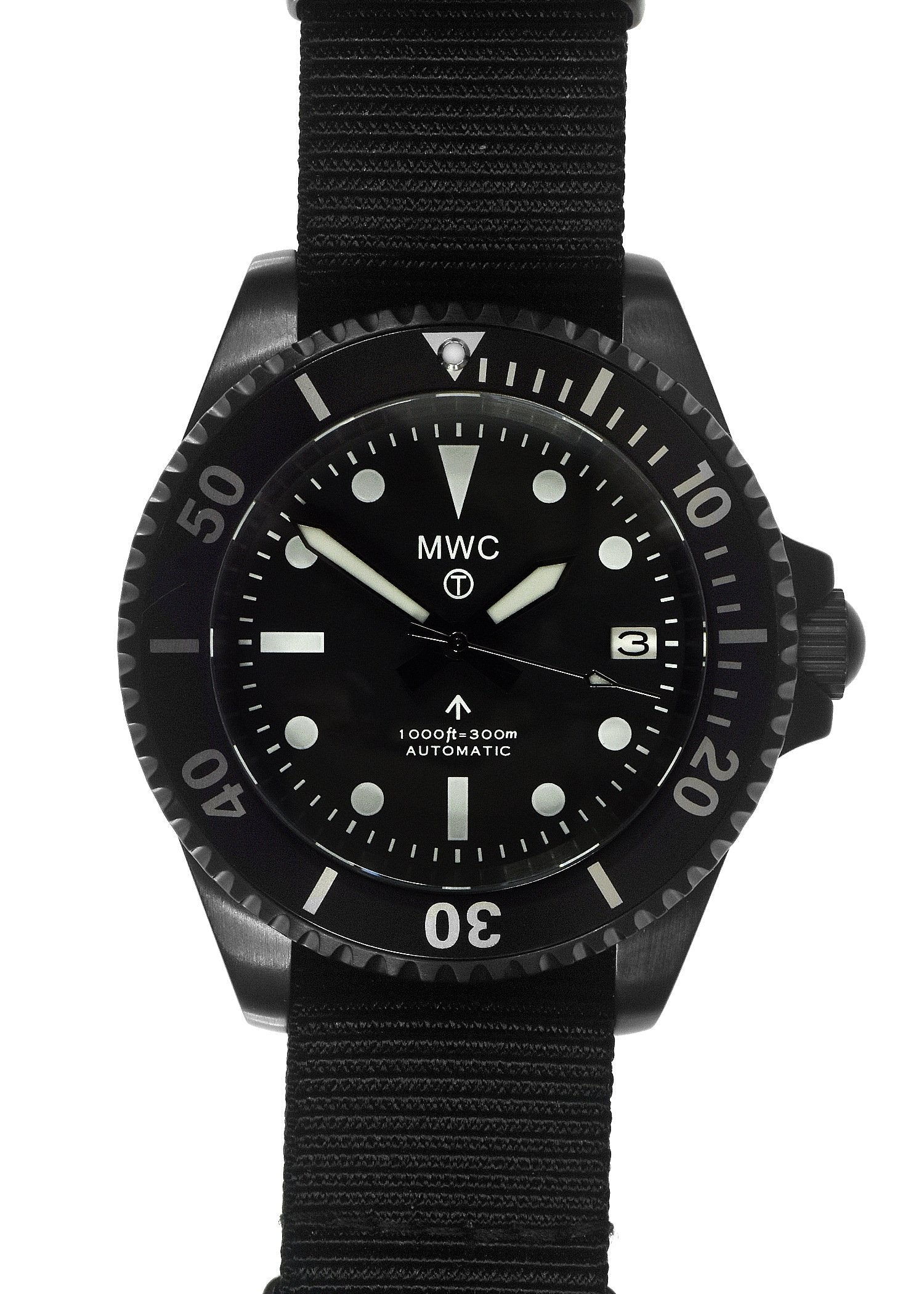 These diver watches are a remake of one of MWC's 1980s models in a black PVD Steel case, one of the variants of these watches was remade specifically for a U.S. contractor who had secured a large sale to one of their clients, the watch has a robust black PVD stainless steel case and is equipped with a high performance automatic 24 jewel self-winding movement. MWC have made a number of upgrades to the original watch such as the shatter and scratch-resistant sapphire crystal and increased water resistance rating.