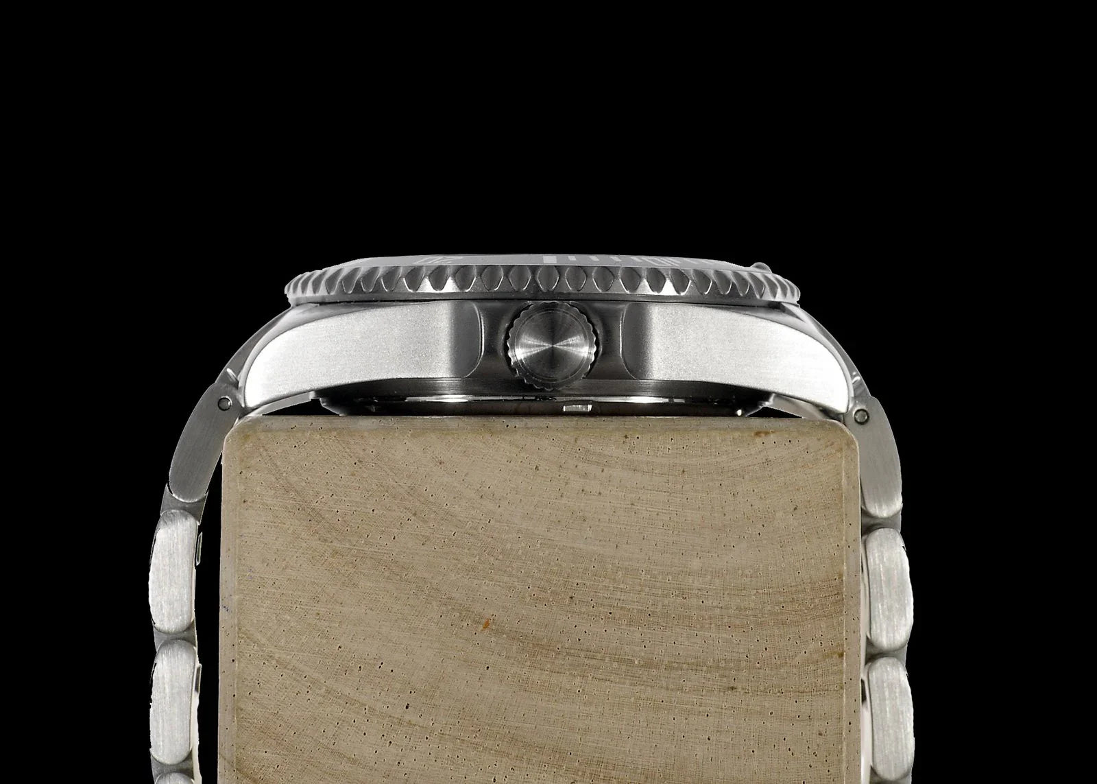 The watch case measures 45mm including the crown and 40mm excluding the crown. It features a 20mm steel bracelet, offering a sleek and durable alternative to traditional webbing straps.