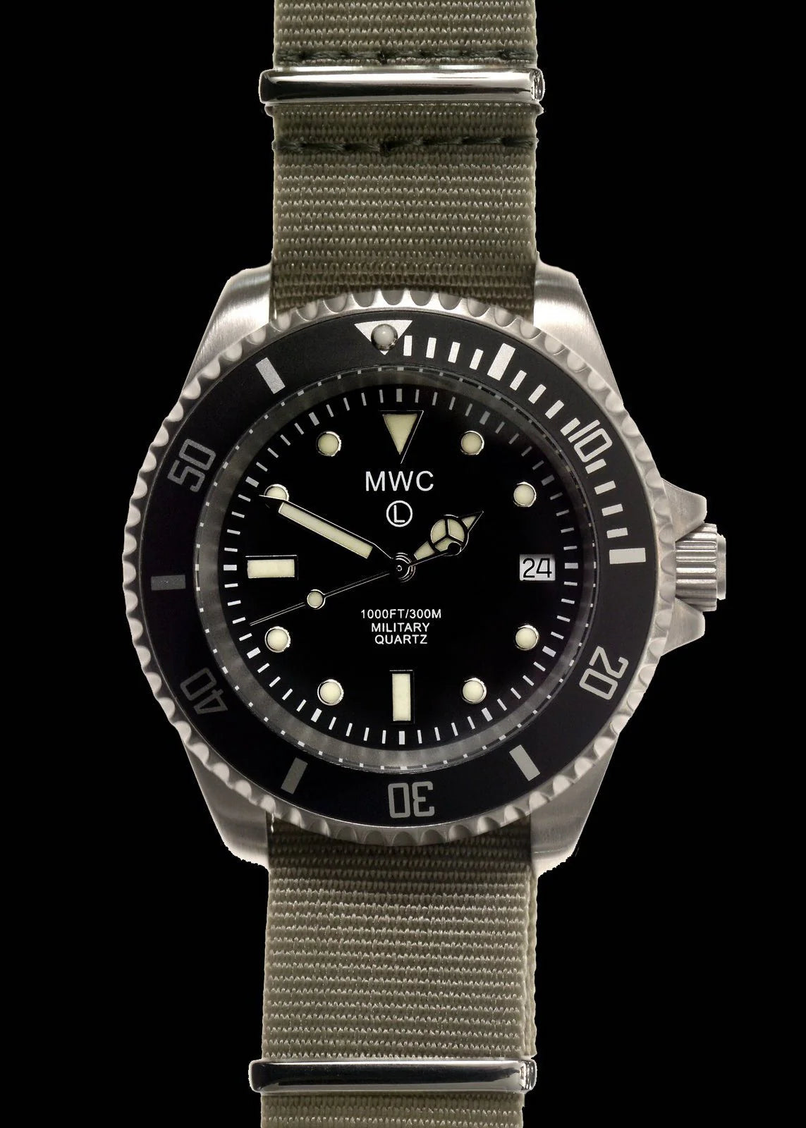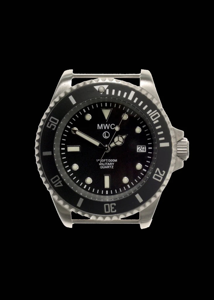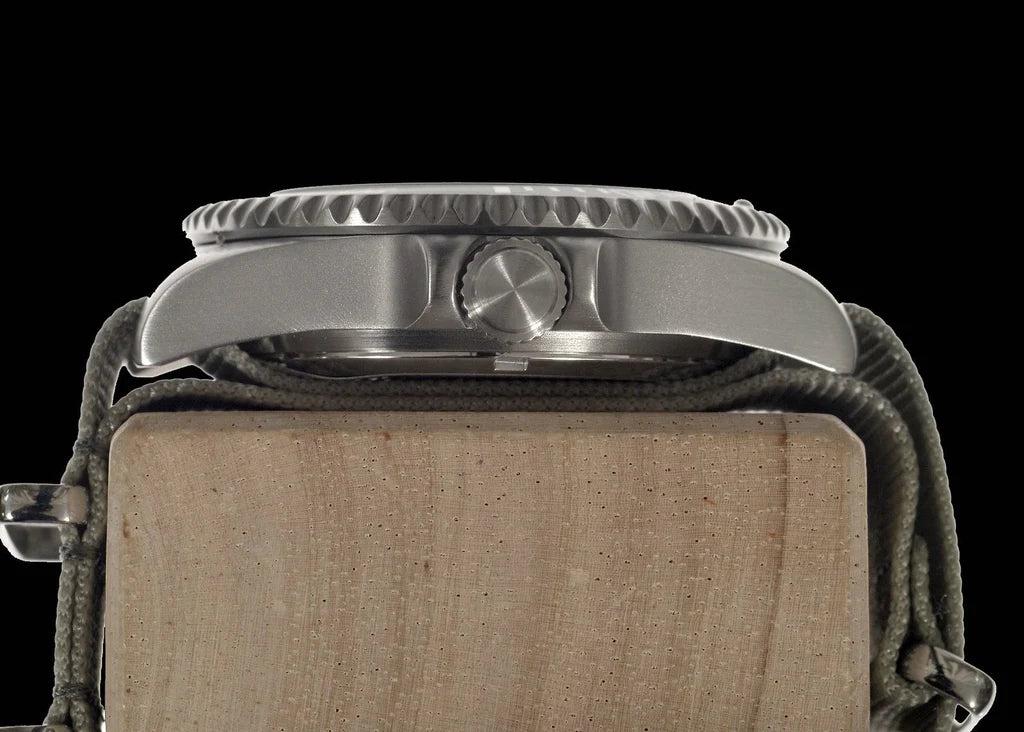 This contemporary military divers watch in stainless steel finish is one of our most popular divers models and has a high performance Ronda 715li quartz movement which provides an incredible 10 year battery life combined with a very high degree of accuracy. This watch also has hacking functionality, meaning that the second hand stops when the crown is pulled out to the time setting position. The hacking feature enables you to set the watch exactly within a second or two of the exact time it's also useful in situations where people need to synchronize their watches to exactly the same time.