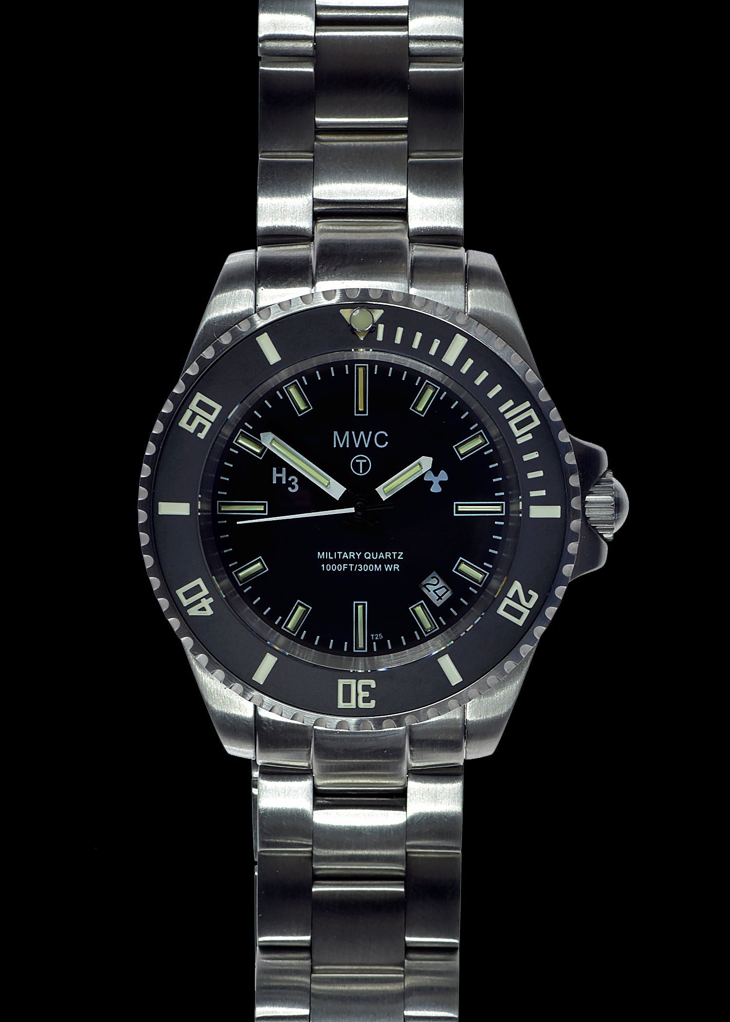 The Tritium GLTS on this watch provides exceptional visibility, especially in low-light or nighttime conditions. The Tritium vials on the H3 dial are up to 100 times brighter than traditional watch dials, allowing for immediate time reading at a glance. For a comparison of Tritium GTLS tubes and Super-LumiNova, click here.