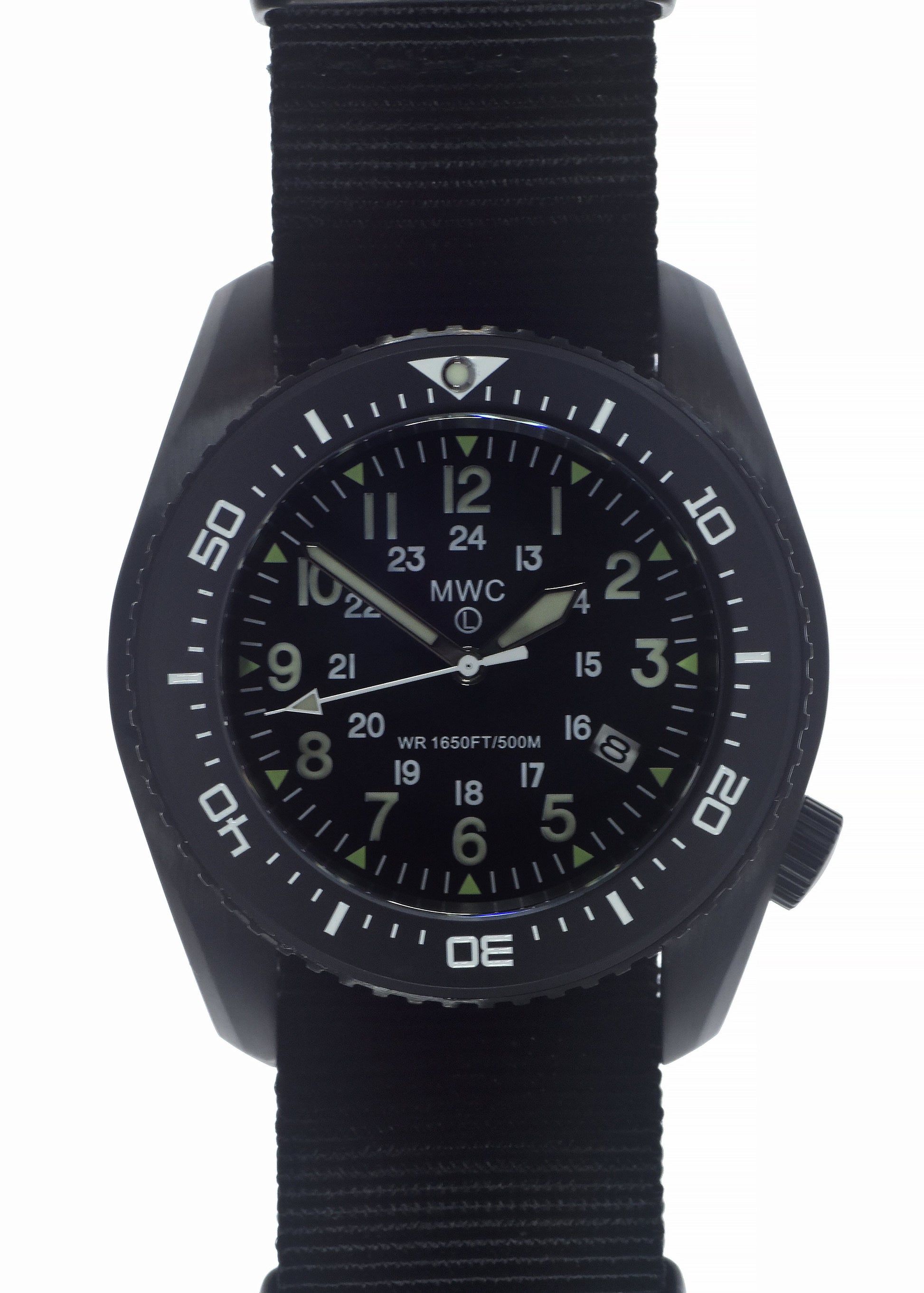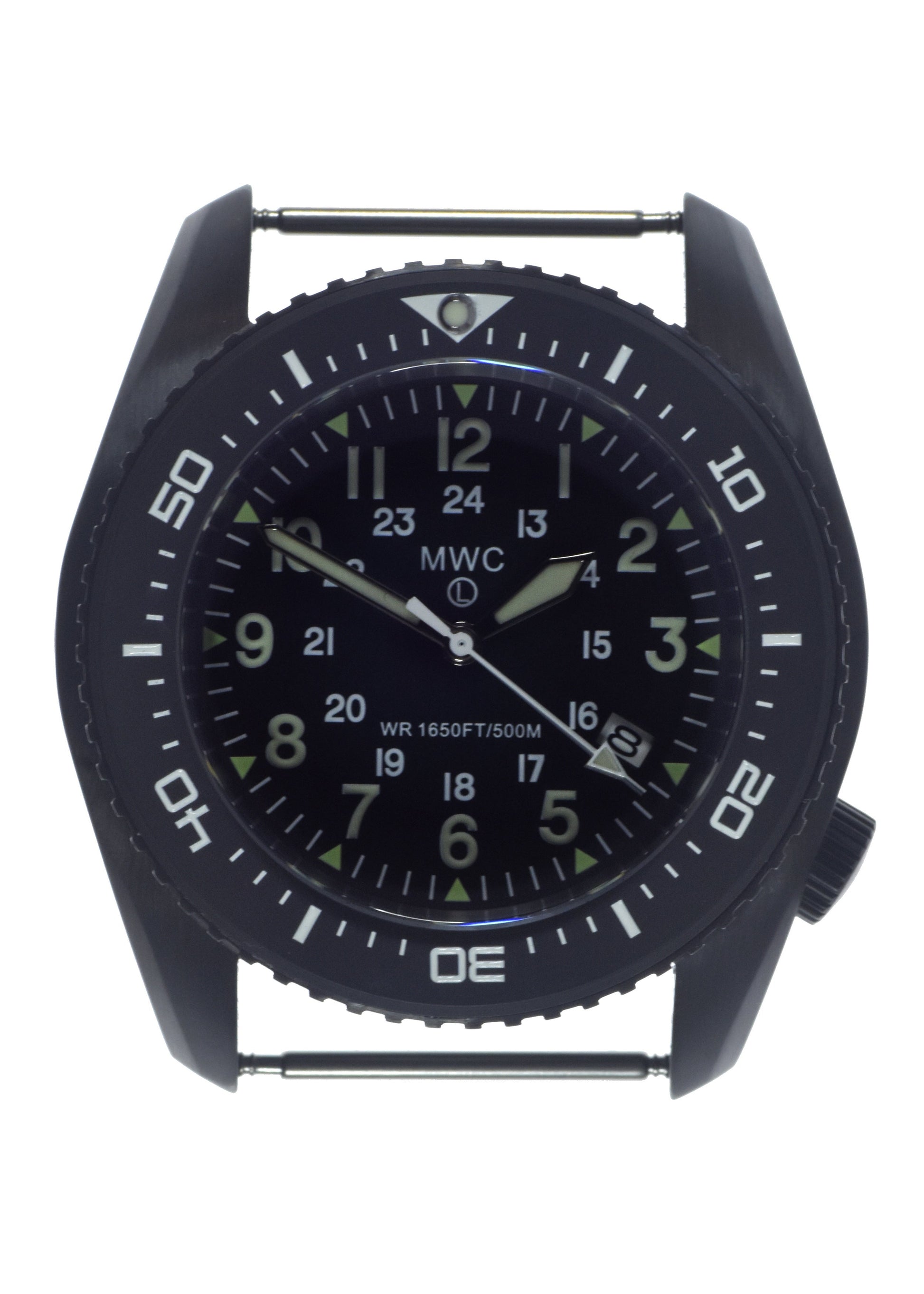The MWC Kampfschwimmer (Military Diver) 500 m water-resistant models with helium escape valve are one of MWC's latest heavy-duty range of divers watches and have a significantly more robust case than most other military dive watches, they also have additional crown protection, in addition, this model also has the advantage of an impact-resistant sapphire crystal and a scratch-resistant ceramic bezel.