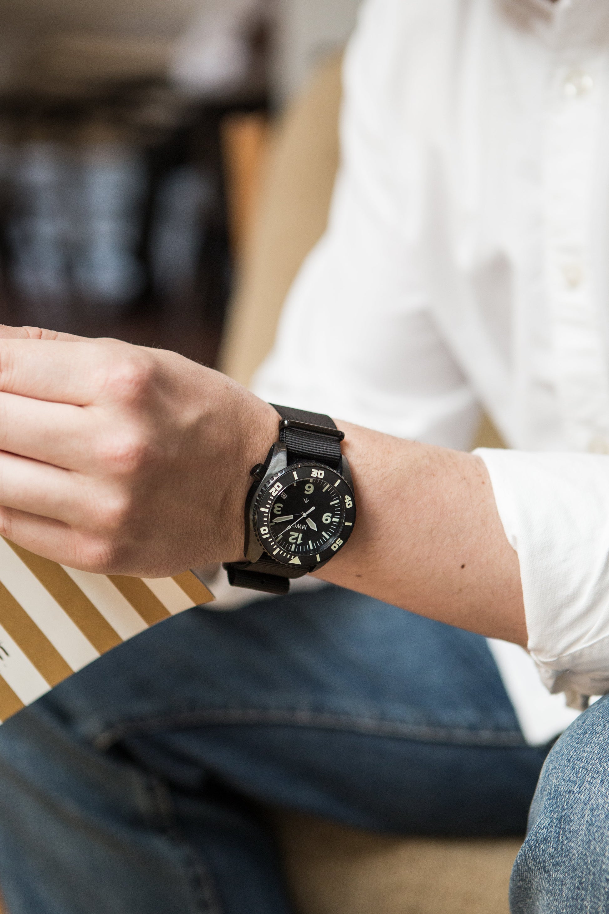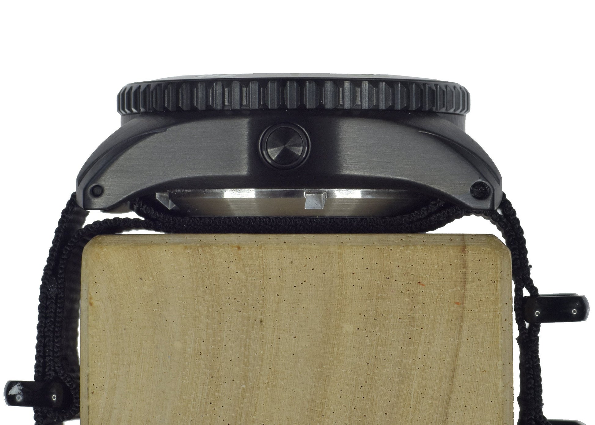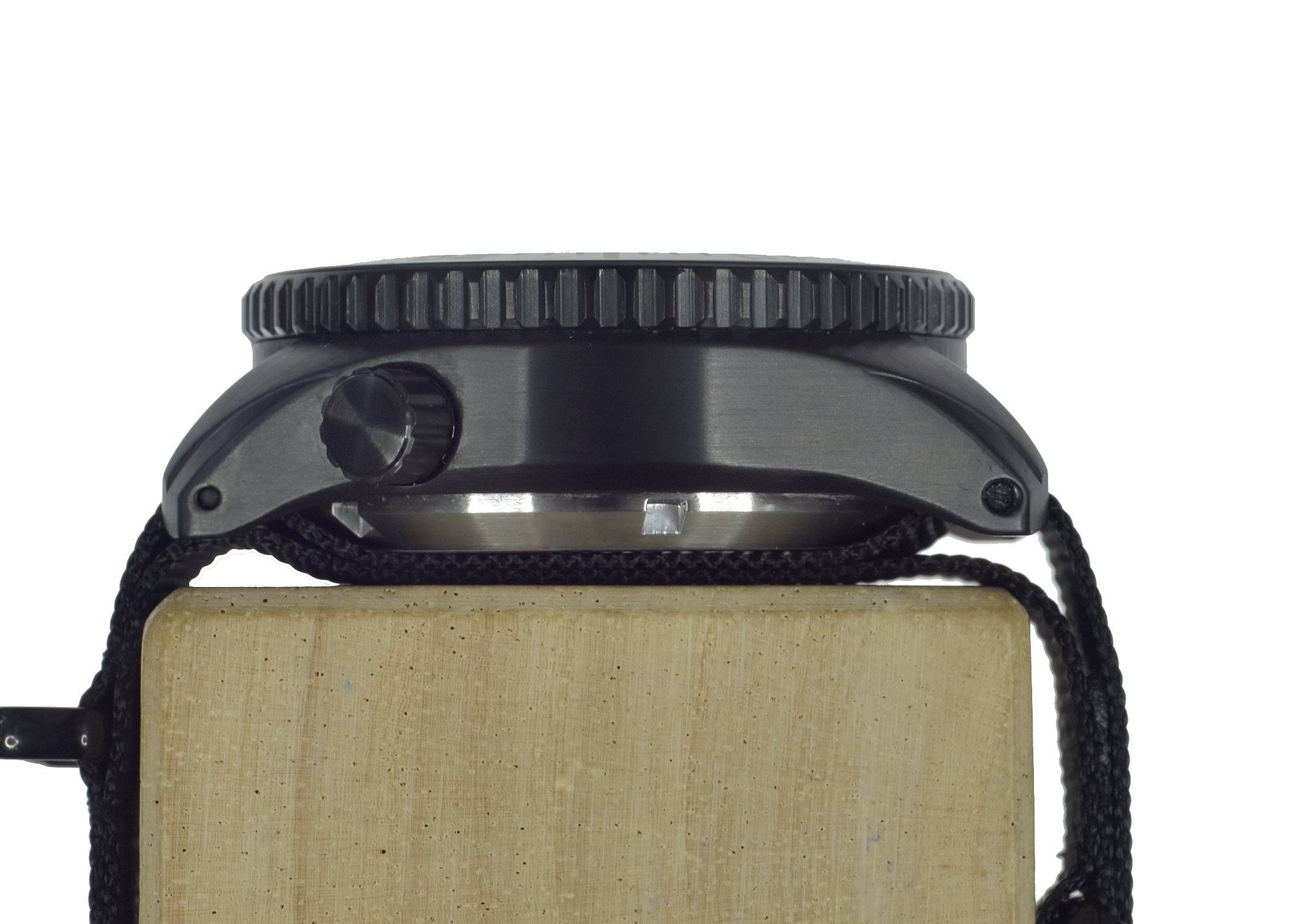 This particular variant has a 12-hour European military pattern dial and is finished in black PVD stainless steel. The special covert matt black nonreflective PVD finish used for this watch is often specified in military contracts for many special forces units as well as by anti-terrorist units and for various covert operations. In the PVD process, the steel is not black all the way through because the color is created by a special chemical PVD plating process which is vastly superior to the painted finish used on some lower quality watches which can easily fade or rub off. This PVD process means that the color of the steel is altered at a molecular level, therefore it will not deteriorate even during heavy usage although it can be destroyed if the case is badly damaged by a piece of metal being gouged out or if the case is worn down by continuous heavy abrasion against rocks, etc.