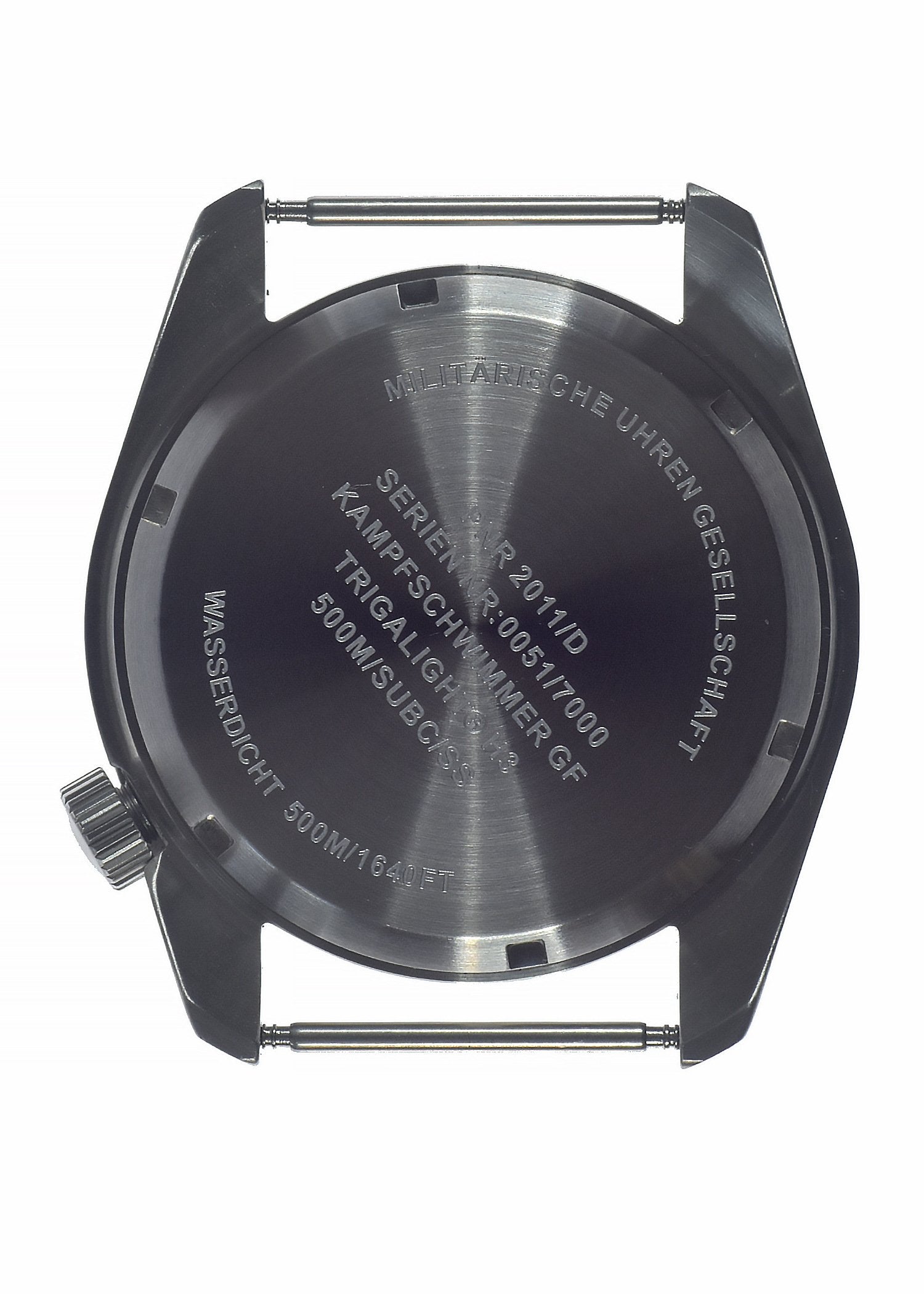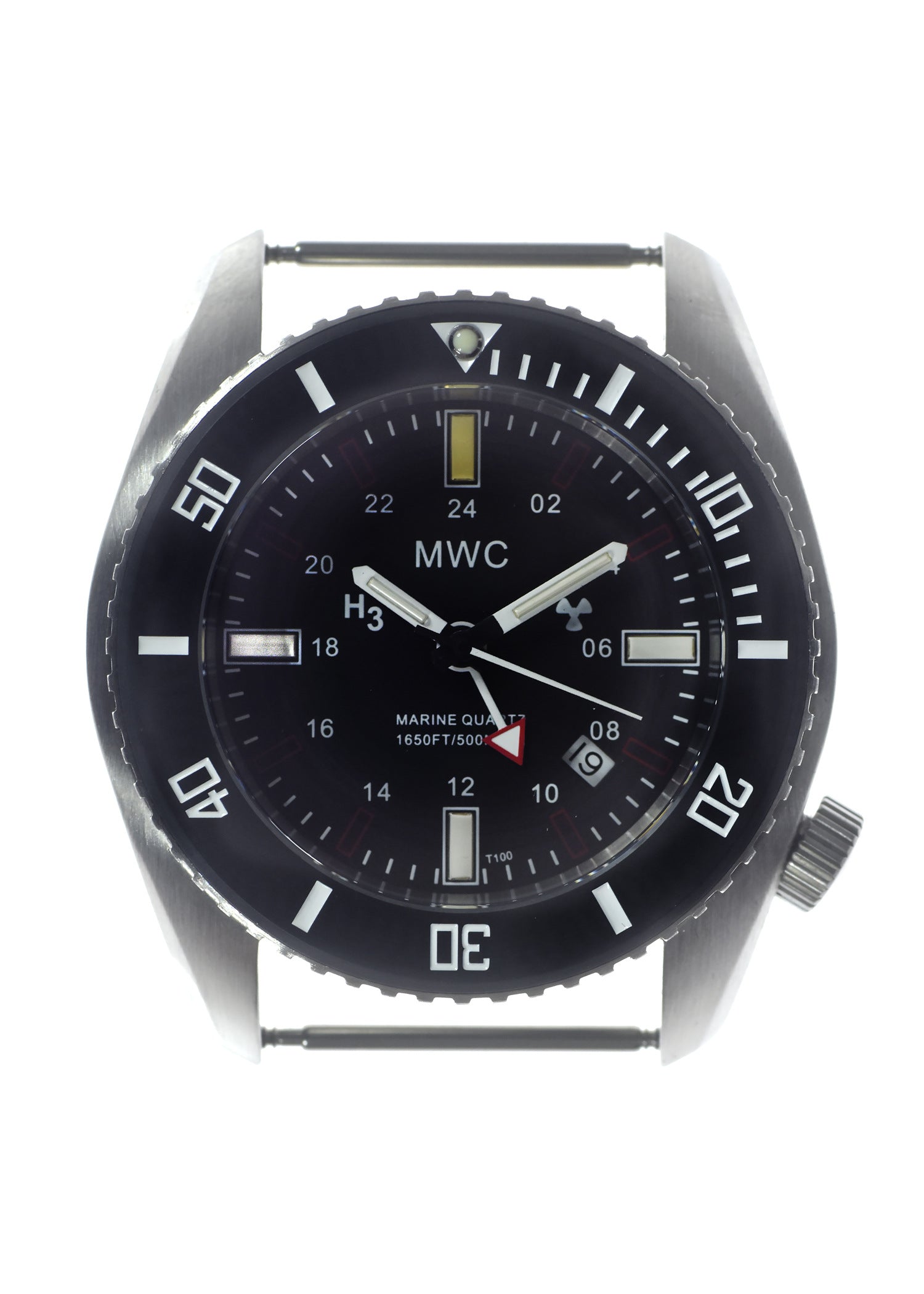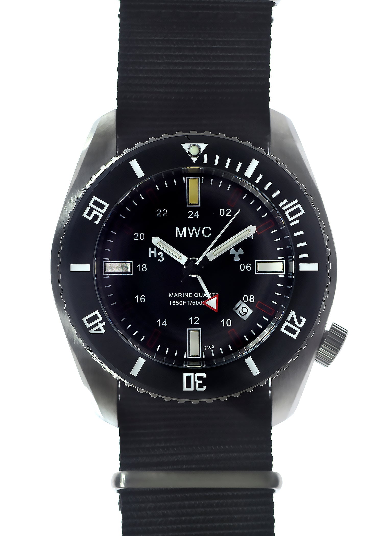 The MWC "Naval Crew" range of Military Divers models are one of MWC's latest heavy-duty ranges, there are two models stainless steel finish the other in covert non-reflective PVD steel, the watches use red T100 tritium GTLS tubes which makes them superior to alternative watches because they can successfully preserve night vision on the bridge of a ship or in a submarine, submarines are normally 'rigged for red' to allow use of the periscope at night, dusk and dawn without interference from the bright light in the control room. When coming to periscope depth a submarine is at its most vulnerable to collision, and red light gives the operator additional time as his eyes do not need to adjust to night conditions. These watches were ordered by submarine crews specifically for this purpose.
