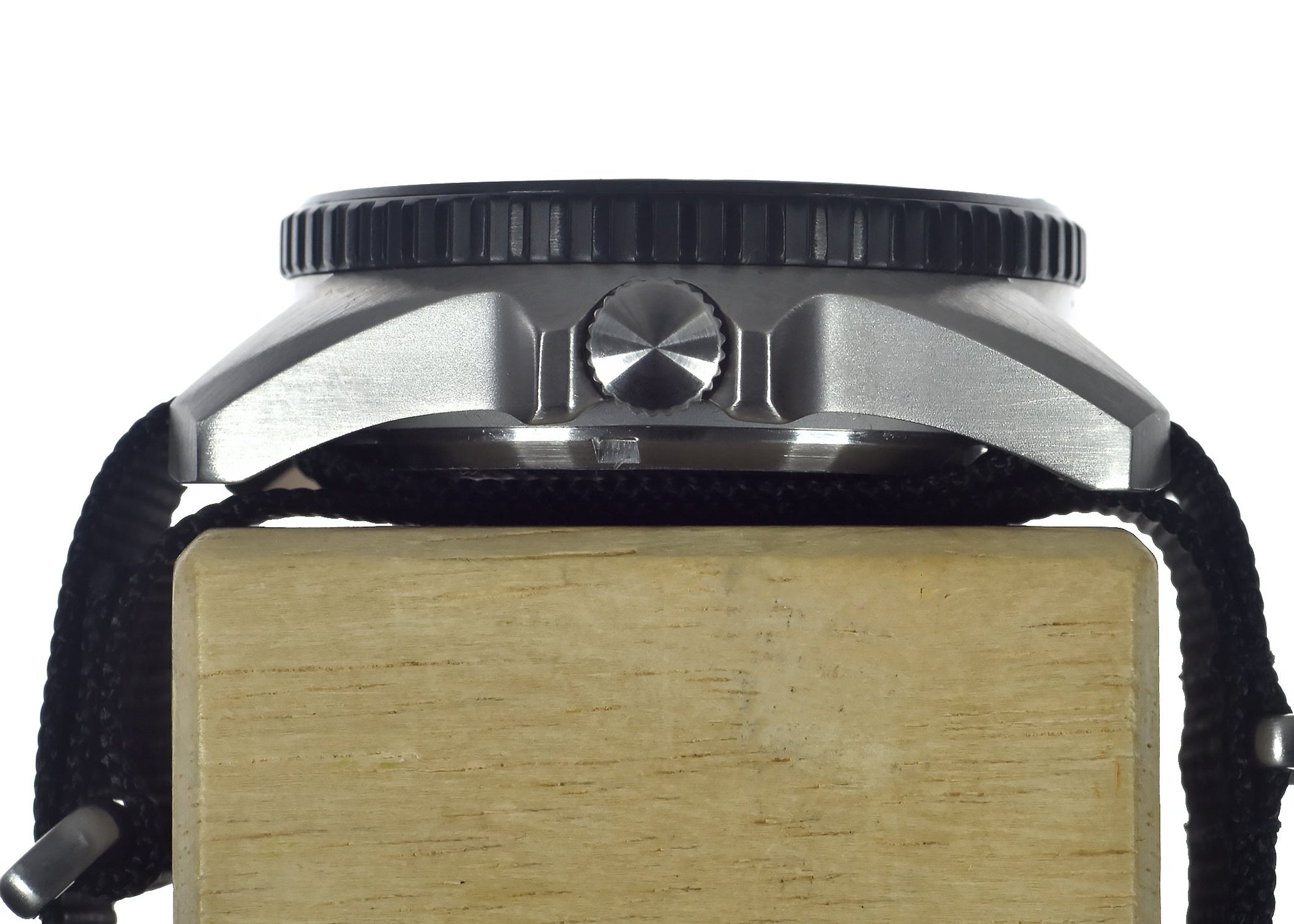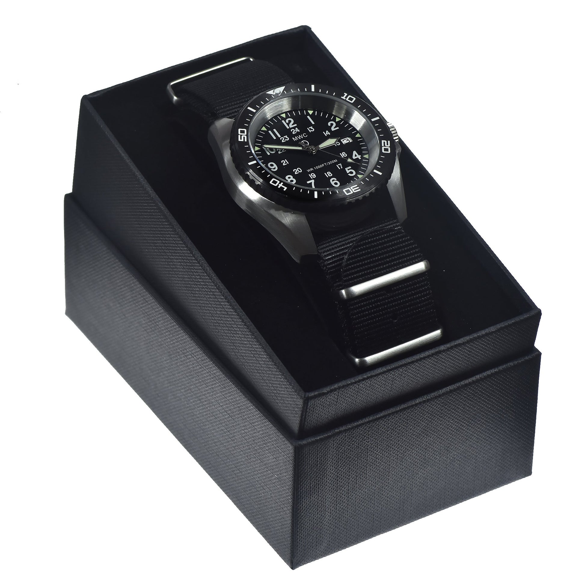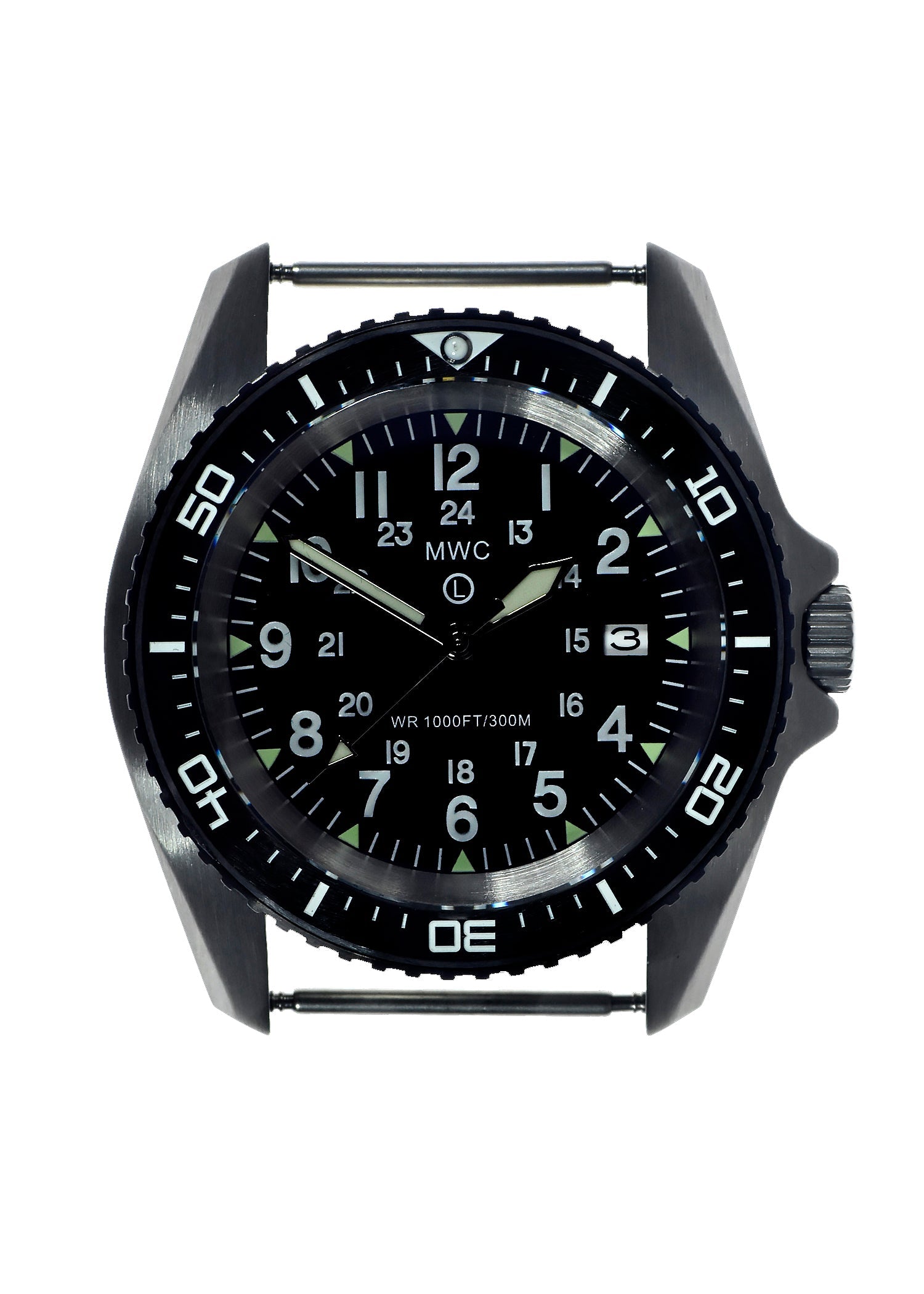 The MWC Kampfschwimmer (Military Diver) models are one of MWC's latest heavy duty range of divers watches and have a significantly more robust case than most other military dive watches, they also have additional crown protection, in addition this model also has the advantage of an impact resistant sapphire crystal and a scratch resistant ceramic bezel. These models also use a wider strap at 24mm (most military divers watches use a 20mm strap) and a thicker bezel design. The thicker bezel makes it significantly easier to grip which is a feature which was specified in a procurement contract because these watches were specifically designed for use by Police and Military divers as well as for use in inflatables operating in cold and extreme environments. This watch is the same as product code XLD/AU/24/SSPVB/FP the only difference is that rather than solid bars it has spring bars which are preferable for people who regularly tend to swap straps.